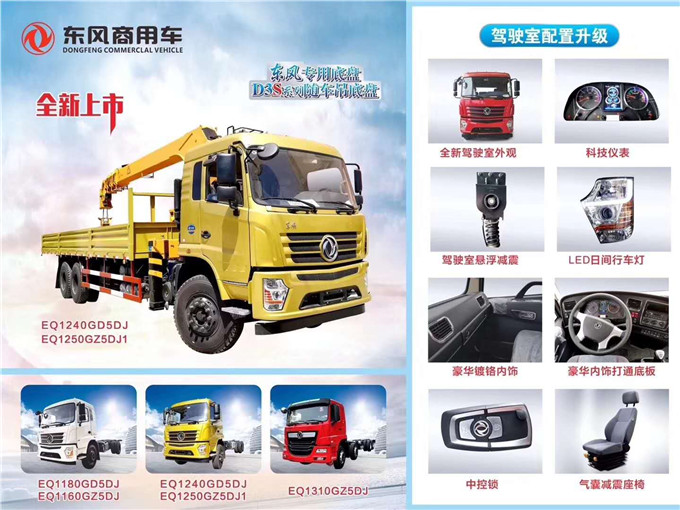 東風D3駕駛室,新式4幅方向盤(操作更加舒適),通道式內部空間(合格證人數為三人時上戶無憂),電動門窗,氣囊座椅,2點懸浮,玉柴6缸240馬力/270馬力國五發動機,陜齒法士特8JS118A(帶高低速)變速箱,300三層通體大梁(第三層從駕駛室后懸直通到尾部),東風德納5.5噸前橋雙11.5噸后橋,新式電瓶架,鋁合金儲氣罐和油箱,帶空調,軸距5900+1300,1100全車鋼絲輪胎,符合7258法規,原裝法士特取力器和東風科技ABS。車廂8300*2450*550(特寬車廂)